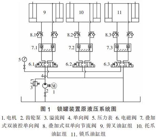 蒸汽管道流量計原液壓系統(tǒng)圖如圖 1 所示。 通過分析圖 1 發(fā)現(xiàn),原液壓系統(tǒng)中剪叉油缸組、托爪油缸組及鎖爪油缸組并聯(lián)安裝,并均由齒輪泵供油,該系統(tǒng)設計簡單,液壓元件選擇不夠合理,工作效率低,電機發(fā)熱大,主要存在的問題: