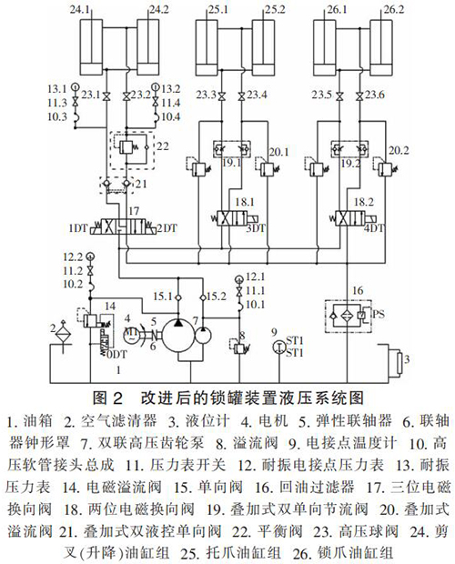 (2)由于升降油缸和托、鎖爪油缸的工況不同,所需油壓也不同,原液壓系統(tǒng)中齒輪泵統(tǒng)一供油,整個工作過程中系統(tǒng)功率消耗大,不夠節(jié)能,工作電機始終帶載運行,不僅功率損耗大,而且易引起油溫急劇增加,對整個提升系統(tǒng)及液壓系統(tǒng)的性能和壽命造成惡劣影響;