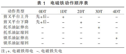改進后液壓系統(tǒng)工作原理:通過溢流閥調整剪叉油缸工況所需壓力,通過疊加溢流閥來調整托爪和鎖爪工況所需壓力。 剪叉平臺上升(剪叉油缸縮回)或下降(剪叉油缸伸出)時 0DT 先得電,當剪叉油缸到位后 0DT 失電,大泵供油無壓流回油箱。 通過電磁換向閥 17(1DT 和 2DT 的得失電)來控制剪叉油缸的伸出或縮回,通過電磁換向閥 18(3DT 和4DT 的得失電)來控制托爪和鎖爪的伸出和縮回。改進后液壓系統(tǒng)的電磁鐵動作順序如表 1 所示。