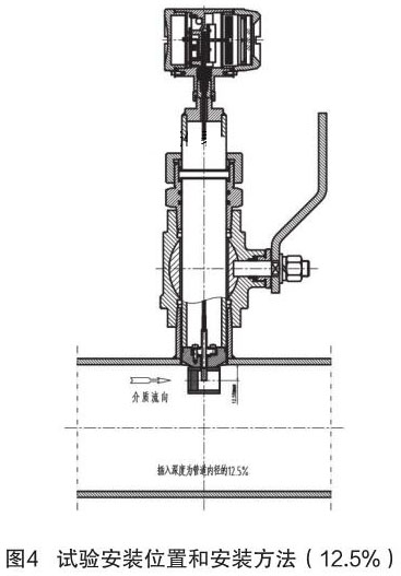 根據(jù)中華人民共和國(guó)機(jī)械行業(yè)標(biāo)準(zhǔn):JB/T9249-2015《蒸汽計(jì)量表》進(jìn)行插入式蒸汽計(jì)量表的研制與設(shè)計(jì)。在試驗(yàn)過程中,因?yàn)槔碚撗芯坎怀浞?,再加上?jīng)驗(yàn)不足,采用插入深度是按照以往其它產(chǎn)品(插入式電磁流量計(jì))的經(jīng)驗(yàn),以插入深度為現(xiàn)場(chǎng)管道內(nèi)徑的 12.5% 進(jìn)行試驗(yàn),其對(duì)介質(zhì)流量的檢測(cè)值與同種規(guī)格管道法蘭式結(jié)構(gòu)的蒸汽計(jì)量表進(jìn)行比較,偏差值較大、儀表準(zhǔn)確度無法滿足設(shè)計(jì)要求。試驗(yàn)安裝位置和安裝方法如圖 4 所示。