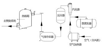以原料萘為例。萘由原料儲罐經(jīng)液萘泵加壓后進(jìn)入萘蒸發(fā)器,液萘在萘蒸發(fā)器內(nèi)由中壓蒸汽加熱汽化分離,經(jīng)流量調(diào)節(jié)閥、流量計(jì)和氣萘切斷閥后進(jìn)入汽化器;空氣經(jīng)風(fēng)機(jī)加壓后,經(jīng)空氣加熱器加熱后進(jìn)入汽化器,氣萘和空氣在汽化器內(nèi)混合均勻后進(jìn)入氧化反應(yīng)器上部,經(jīng)催化床層發(fā)生氧化反應(yīng)生成苯酐和少量的副產(chǎn)物(以順酐、苯甲酸、萘醌、和鄰苯二甲酰亞胺為主);反應(yīng)氣體經(jīng)壓縮空氣計(jì)量表冷卻后再進(jìn)入切換冷凝器進(jìn)行凝華捕集,少量未被捕集的有機(jī)物和不凝氣體經(jīng)尾氣管路進(jìn)入蓄熱焚燒裝置焚燒處理,焚燒后的尾氣達(dá)標(biāo)排放。