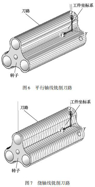 三葉轉(zhuǎn)子的曲面是由多條直線組成的直紋面,加工三葉轉(zhuǎn)子這種高精度的直紋曲面必須采用四軸或五軸聯(lián)動的數(shù)控機床。三葉轉(zhuǎn)子的銑削方式有刀具路徑平行軸線銑削、繞軸線銑削兩種刀具路徑。平行軸線銑削原理為: 刀具在轉(zhuǎn)子曲面上沿 X軸從轉(zhuǎn)子的一端移動到另一端銑出一條直線,銑削下一點位時旋轉(zhuǎn) A 軸 Z 軸聯(lián)動再次從轉(zhuǎn)子一端銑削到另一端,采用往復(fù)銑削直到完成整個轉(zhuǎn)子曲面,刀具路徑如圖 6 所示。繞軸線銑削原理為: 刀具在轉(zhuǎn)子曲面上 AZ 軸聯(lián)動刀具繞 A 軸軸線銑削,銑削下一點位時移動 X 軸,再次 AZ 軸進(jìn)行聯(lián)動銑削,采用往復(fù)銑削直到完成整個轉(zhuǎn)子曲面,刀具路徑如圖 7 所示。由于繞軸銑削需要 AZ 軸聯(lián)動切削,而數(shù)控機床可以達(dá)到的進(jìn)給率是由*慢的軸決定的,所以,這種刀具路徑在精加工高速銑削時并不適用。