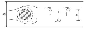 智能蒸汽流量計(jì)是由漩渦發(fā)生體、頻率檢測器和信號轉(zhuǎn)換器等環(huán)節(jié)組成,輸出 4 ~ 20 mADC 信號或脈沖電壓信號。其測量原理是在流動的流體中的垂直流動方向安放 1 根或多根非流體型阻流體,在一定的流量范圍內(nèi),流體在阻流體兩側(cè)交替地分離、釋放出 2 串頻率正比于管道內(nèi)的平均流速、規(guī)則的、不對稱有規(guī)律的交替漩渦列,如圖 1 所示,且兩側(cè)漩渦旋轉(zhuǎn)方向相反 。采用檢測元件測出漩渦頻率就可以推算出流體的流量。