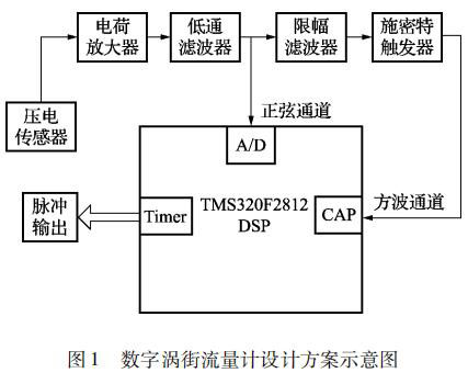 本文設(shè)計(jì)的基于 TMS320F2812 DSP 的數(shù)字管道壓縮空氣流量計(jì)的信號(hào)處理系統(tǒng)由前置放大電路和數(shù)字信號(hào)處理電路兩部分組成。本文選用的前置放大電路即為目前被廣泛應(yīng)用的普通管道壓縮空氣流量計(jì)的前置放大電路,主要由電荷放大電路、低通濾波電路、限幅濾波電路和施密特觸發(fā)電路組成; 對(duì)于經(jīng)壓電傳感器測得的渦街信號(hào)采用了頻域分析和時(shí)域分析相結(jié)合的方式,即由前置放大電路和數(shù)字信號(hào)處理電路相配合。時(shí)域分析通道利用 DSP 事件管理器的捕獲模塊,對(duì)前置放大電路輸出的方波進(jìn)行頻率計(jì)算,然后再由 DSP 事件管理器通用定時(shí)器的比較輸出模塊進(jìn)行脈沖輸出。頻域分析通道即 DSP對(duì)低通濾波電路輸出的疊加了許多噪聲的正弦信號(hào)進(jìn)行 A/D 采樣,再利用 DSP 對(duì) A/D 采樣的結(jié)果進(jìn)行頻譜分析,從而得出此時(shí)渦街信號(hào)的頻率,*后由 DSP 通用定時(shí)器的比較輸出模塊進(jìn)行脈沖輸出。系統(tǒng)設(shè)計(jì)方案示意圖如圖 1 所示。