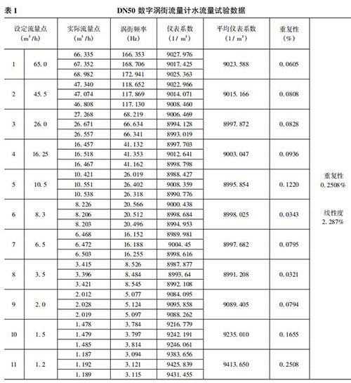 將本文實(shí)現(xiàn)的數(shù)字管道壓縮空氣流量計(jì)在上述 50mm 口 徑( 簡稱 DN50) 的水流量試驗(yàn)裝置上進(jìn)行試驗(yàn)。先在其正常流量范圍內(nèi)進(jìn)行試驗(yàn),流量從大到小逐漸降低,之后不斷探求其所能測量的*小流量。每個(gè)流量點(diǎn)試驗(yàn)三次,計(jì)算其重復(fù)性、平均儀表系數(shù)和線性度。水流量試驗(yàn)數(shù)據(jù)如表 1 所示。