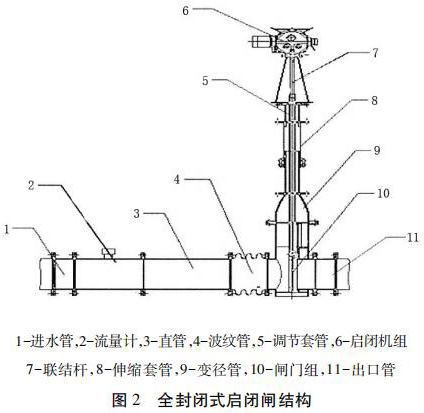 包括進(jìn)水管、直管、出水管、電廠蒸汽流量計(jì)組和啟閉機(jī)組,進(jìn)水管、直管、出水管從左到右依次連接,電廠蒸汽流量計(jì)組安裝在直管和出水管之間且位于出水管的入口處,電廠蒸汽流量計(jì)組通過(guò)聯(lián)結(jié)桿與啟閉機(jī)組的輸出端連接。為防止泥沙淤積影響啟閉,電廠蒸汽流量計(jì)采用閘板式啟閉結(jié)構(gòu)。密封式啟閉閘為整體封閉管道式,全部采用不銹鋼材料,水流通過(guò)管道流出讓整個(gè)閘井內(nèi)干燥無(wú)水。伸縮套管與波紋管的設(shè)計(jì)讓檢修與清理淤泥更加方便。電廠蒸汽流量計(jì)裝有荷載限制器,其布置受力明確、結(jié)構(gòu)緊湊、動(dòng)作可靠。當(dāng)?shù)蹙呱系暮奢d達(dá)到額定值的 110%時(shí),或電機(jī)電流超過(guò)額定電流 150%時(shí),系統(tǒng)自動(dòng)切斷操作電源以保護(hù)設(shè)備安全。