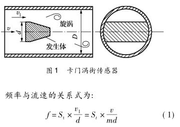 蒸汽流量計(jì)利用“卡門(mén)渦街”原理。在流體中安放旋渦發(fā)生體,流體在旋渦發(fā)生體的下游兩側(cè)交替地分離出兩列有規(guī)律的交錯(cuò)排列的旋渦,在一定雷諾數(shù)范圍內(nèi),該旋渦頻率與旋渦發(fā)生體的幾何尺寸、管道的幾何尺寸有關(guān),旋渦的頻率正比于流量,其結(jié)構(gòu)原理如圖 1 所示。