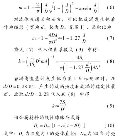 從式 ( 3) 中可以看出,溫度對(duì)蒸汽流量計(jì) K系數(shù)計(jì)量特性的影響主要有如下 3 個(gè)因素: D、m、d,在不同流體介質(zhì)條件下,機(jī)械結(jié)構(gòu)尺寸的變化主要是由于溫度的變化帶來(lái)的熱脹冷縮引起,對(duì)圖 1 所示發(fā)生體,得到 m 的計(jì)算公式為: