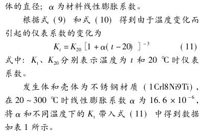 由此計(jì)算分析可以看出,隨著介質(zhì)溫度升高或降低,蒸汽流量計(jì)機(jī)械結(jié)構(gòu)因熱脹冷縮 ( D、m、d) 尺寸發(fā)生變化,引起儀表系數(shù) K t 隨之變化,因此,蒸汽流量計(jì)使用時(shí)一定要重視 “工況狀態(tài)下的溫度設(shè)定”這個(gè)參數(shù)設(shè)置,設(shè)定溫度越接近測(cè)量介質(zhì)的溫度,測(cè)量誤差越小。