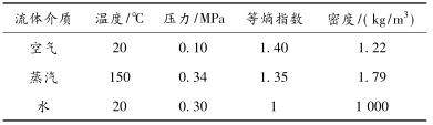 實(shí)驗(yàn)條件下空氣、蒸汽、水為測(cè)試流體介質(zhì)時(shí),各測(cè)試條件參數(shù)如表 2 所示。