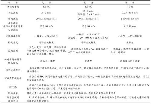 通過(guò)上述蒸汽流量計(jì)的測(cè)量原理和影響因素進(jìn)行全面的分析,蒸汽流量計(jì)在不同介質(zhì)流量測(cè)量中的共性、差異性及安裝應(yīng)用注意事項(xiàng)如表4 所示。