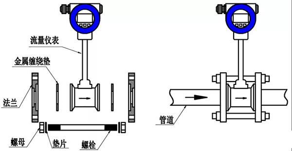(3)在法蘭的內(nèi)槽內(nèi)裝上與管道通徑相同的密封墊圈,將流量計(jì)裝入法蘭中,流量計(jì)的流向標(biāo)應(yīng)與流體方向相同,然后用螺栓緊固好。