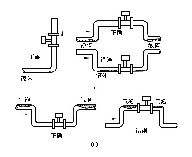 VSF可安裝在室內(nèi)或室外。如果安裝在地井里,有水淹的可能,要選用涎水型傳感器。傳感器在管道上可以水平、垂直或傾斜安裝,但測量液體和氣體時為防止氣泡和液滴的干擾,安裝位置要注意,如圖16所示。