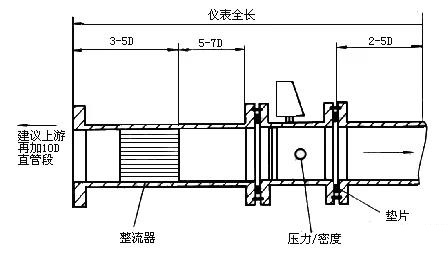 成套安裝,包括前后直管段,流動調(diào)整器等是保證獲得高精確度測量的一個措施,特別這些裝配在制造廠進(jìn)行更能保證安裝的質(zhì)量,圖21所示為一安裝實例。