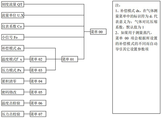 3.1、本版本壓縮空氣流量計(jì)表頭操作界面采用菜單形式進(jìn)行參數(shù)設(shè)置,框圖如下: