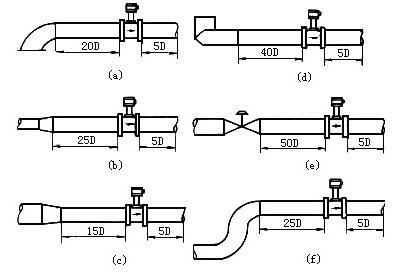 (3) 對于有變徑要求的工藝管線 , 前后直管段的長度分別保證不小于 10 D 和 5 D 就可以了 ; 如果必須在流量計的上游側(cè)選用閘閥 , 那么前直管段的長度不應(yīng)小于 40 D。