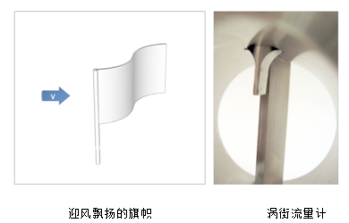 自然界的很多現(xiàn)象都源于渦街原理,比如迎風(fēng)飄揚(yáng)的旗幟,旗桿作為漩渦發(fā)生體, 當(dāng)風(fēng)從旗桿一側(cè)吹來時(shí),旗桿阻擋了風(fēng),分別從旗桿兩側(cè)吹過的氣流在其后形成了漩渦,因此,旗幟能夠隨風(fēng)飄揚(yáng)。在渦街流量計(jì)中,正是采用了“卡門渦街原理”,測(cè)量管中有一個(gè)漩渦發(fā)生體,漩渦的脫落頻率正比于流量,漩渦脫落頻率通過傳感器中的壓電晶體來測(cè)量,公式如下: