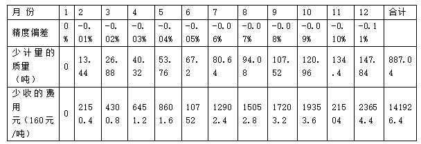 為了簡化計(jì)算,假設(shè)每個(gè)月孔板流量計(jì)因?yàn)槟p而產(chǎn)生的精度變化是線性的,每月精度下降0.01%,那么通過下表可以看出,*一年內(nèi)損失的收益: