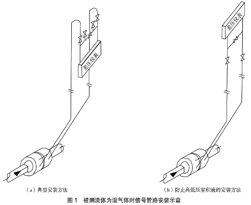 圖1(a)所示是典型的節(jié)流式差壓流量計信號管路安裝圖,在被測流體為濕氣體時,冷凝液理應(yīng)不會進入差壓變送器高低壓室,但從現(xiàn)場反饋信息來看,實際情況是有時還會有微量水滴進入高低壓室。變送器差壓范圍較低時,此微量水滴會引起儀表零點的明顯漂移。有些差壓變送器設(shè)計有兩個排放口,打開下排放口就可將凝液順利排出。但是若采用早期變送器只有中部一個排放口,打開此口無法將高低壓室內(nèi)的凝液排凈,*后只得將變送器拆下,將凝液從信號輸入口中傾倒出來。