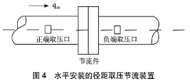 大口徑節(jié)流裝置的取壓方式,人們往往喜歡采用徑距取壓。這種取壓方式的兩個取壓口之間相距1.5D,而管徑又較大,所以取壓口之間的距離較大。在安裝過程中稍有疏忽,就會引入誤差。圖4所示為水平安裝的徑距取壓節(jié)流裝置,用來測量蒸汽流量。規(guī)范要求,正端和負端取壓管在母管上的開口高度應(yīng)相同,兩個冷凝器的高度也應(yīng)一致。如果施工疏忽造成即使10mm的高度差,用肉眼也難以分辨,但會引起實際流量為零時,仍有100Pa左右的輸出。