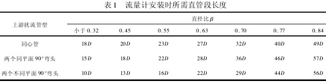 孔板流量計以簡單結(jié)實(shí)、成本低廉及無需額外標(biāo)定等優(yōu)勢在工業(yè)中獲得廣泛應(yīng)用。但它也有自身的缺點(diǎn): 受限于工作原理,量程比限制在3∶ 1~5∶ 1; 在水錘作用下,孔板會變形,如果設(shè)計或安裝不當(dāng)甚至?xí)氯艿? 孔板的直角邊緣在長期運(yùn)行后會磨損,特別是在進(jìn)行蒸汽介質(zhì)測量時會改變孔板特性,影響測量精度,因此必須對孔板進(jìn)行周期檢查并予以更換; 孔板流量計一般需要較長的直管段以保證精度,表 1 給出了不同直徑比β和不同上游擾流布置情況下所建議的直管段長度。